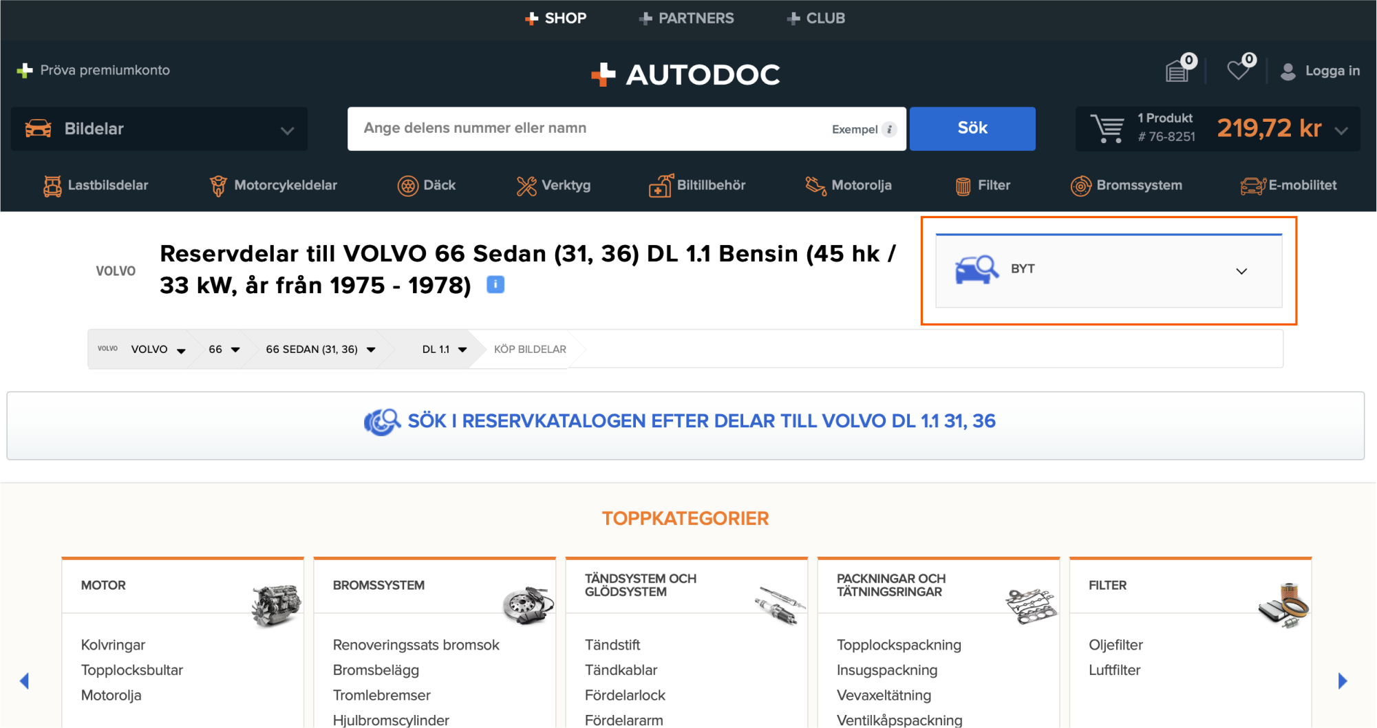 Om du har gjort ett misstag när du angav fordonsuppgifterna kan du ändra dem på katalogsidan genom att klicka på BYT.