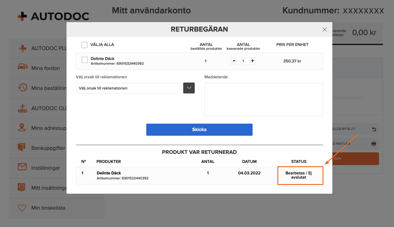 - Klicka på "Beställningsdetaljer" vid beställningen där du skickat in returen.