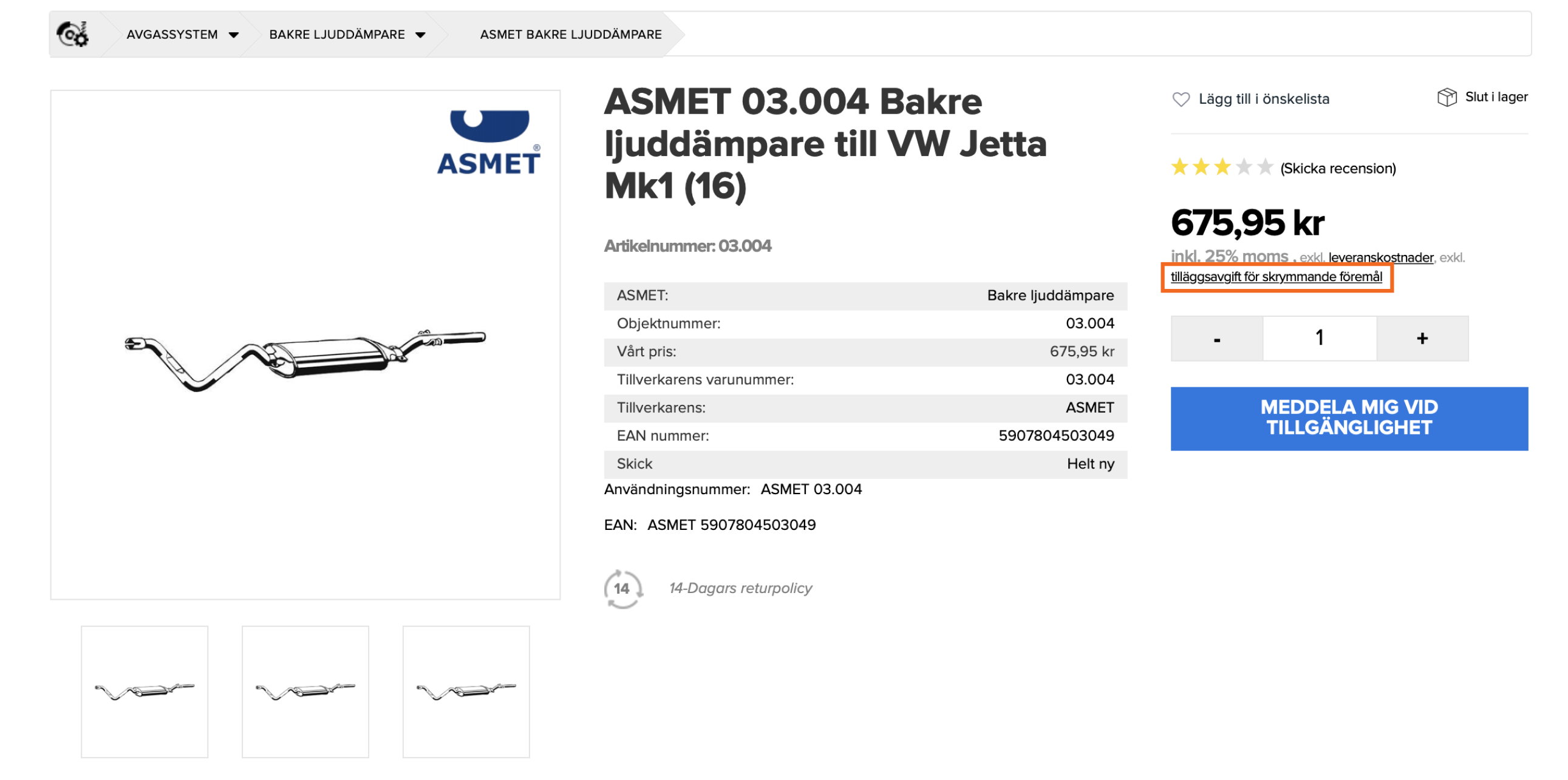 Observera: markeringen bredvid priset anger om den valda produkten är ett skrymmande föremål.