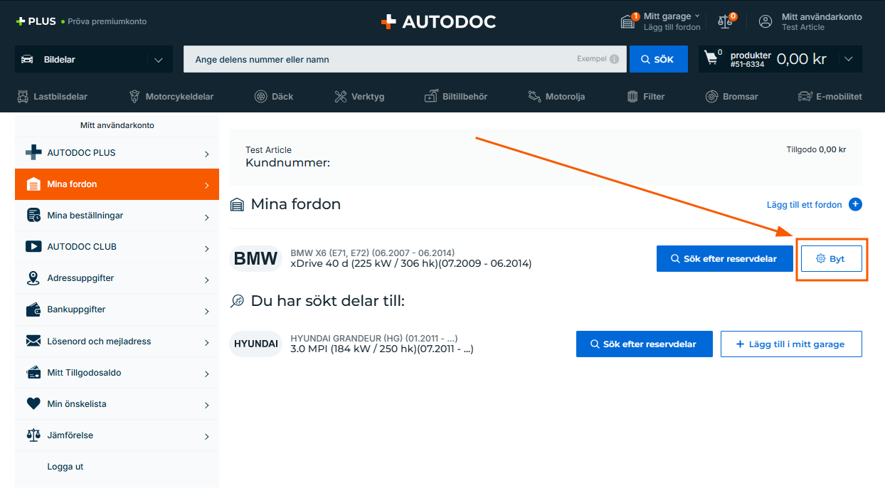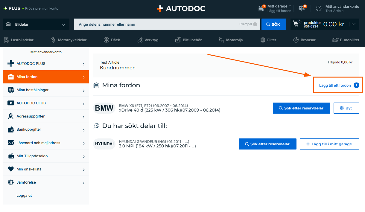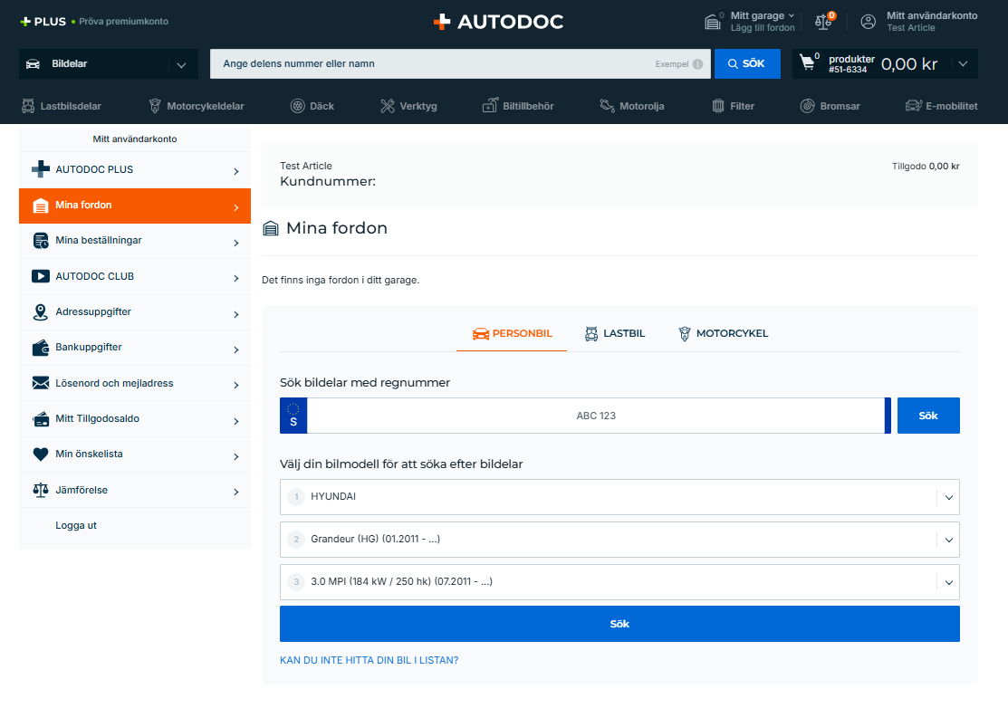 Avsnittet Mina fordon gör att du snabbt kan ta dig till reservdelskatalogen för de fordon du redan sökt efter och köpt delar till i vår onlinebutik.