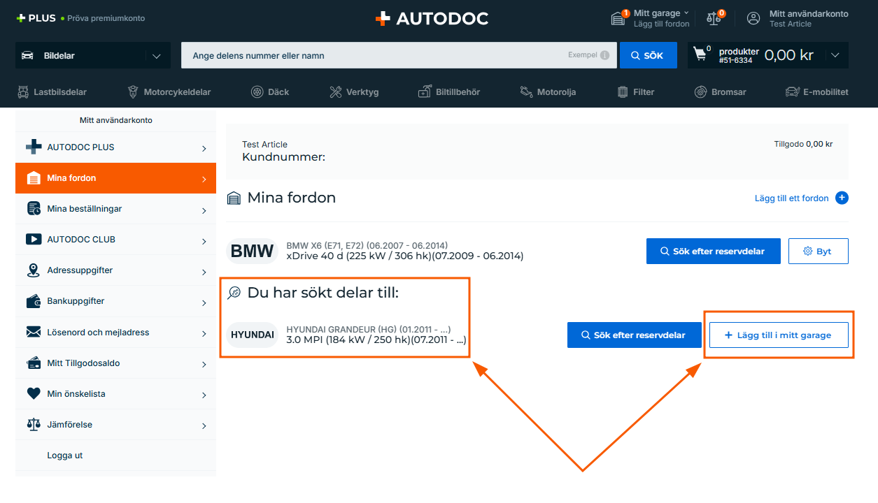 Om du vill lägga till fler fordon i ditt garage kan du välja vilket fordon som helst under avsnittet "Du har sökt delar till" och klicka på "Lägg till i mitt garage". Det läggs omedelbart till i din lista över fordon.