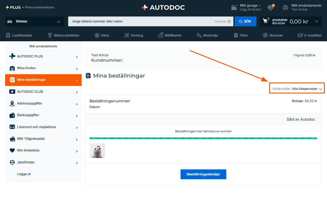 Mina beställningar innehåller information om alla dina beställningar. Beställningarna är listade i omvänd kronologisk ordning (från den senaste till den tidigaste). Du kan visa beställningar från en viss period genom att använda filtret "Sortera efter".