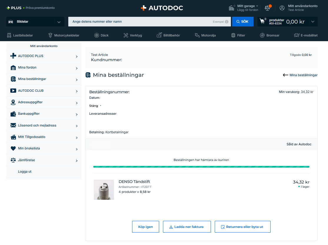 Klicka på "Beställningsdetaljer" för att fortsätta köpa igen, ladda ner fakturan eller skapa en returförfrågan.