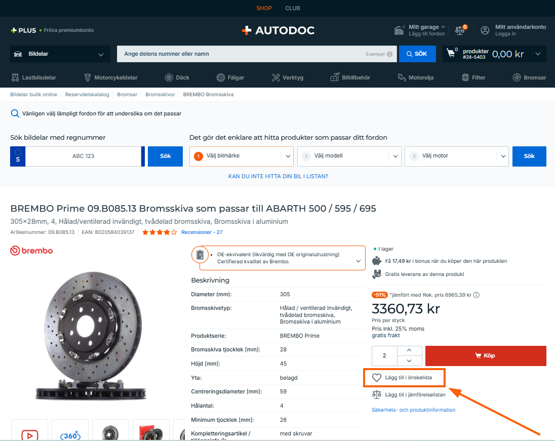 Om du vill lägga till en eller flera artiklar i din önskelista klickar du på den hjärtformade ikonen bredvid varje artikel. Klicka på ikonen igen för att ta bort en artikel från din önskelista.